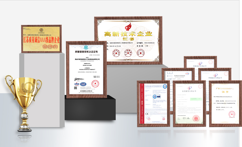 榮獲30余項實用新型和外觀專利證書,乳化機/灌裝機等多款產品被認定為高新技術產品